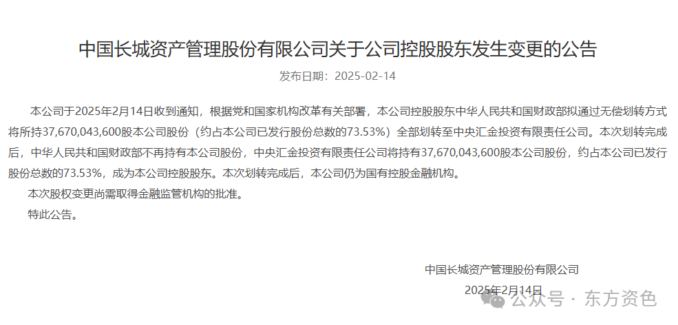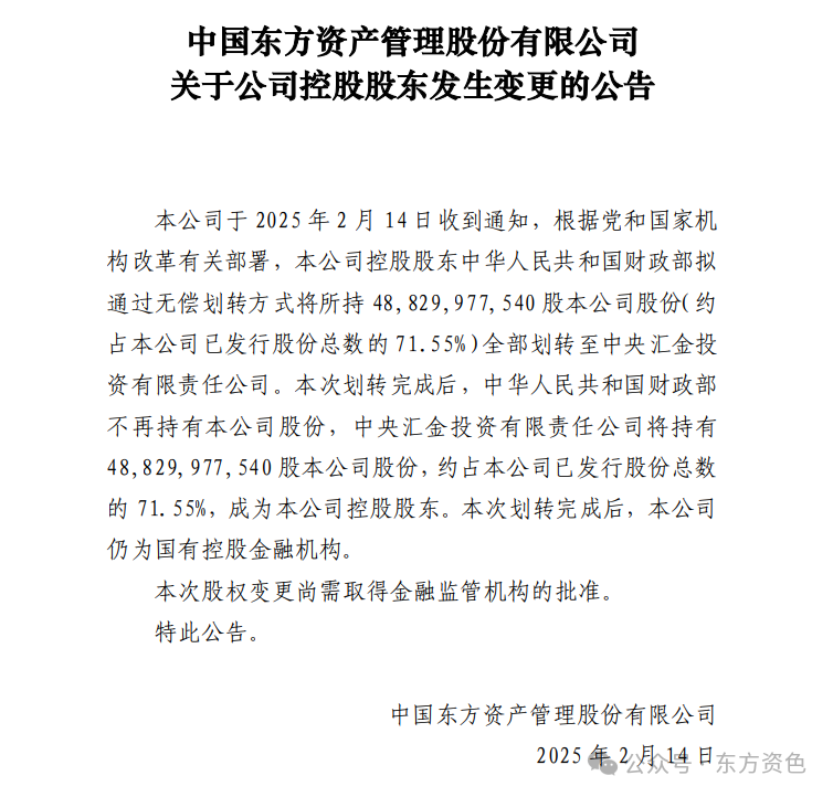 中国东方钞票处分公告称,本公司于2025年2月14日收到见告,笔据党和国度机构纠正关系部署,本公司控股鼓动中华东谈主民共和国财政部拟通过无偿划转形式将所握48,829,977,540股本公司股份(约占本公司已刊行股份总额的71.55%)一都划转至中央汇金投资有限背负公司。