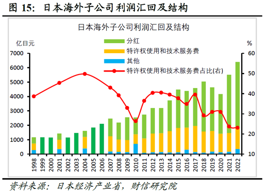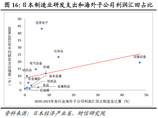 三是外洋阛阓的拓展鼓吹日本企业加多研发参预,助力国内产业结构升级。一方面,为加多自身居品的国际竞争力、扩大大家阛阓份额,外洋子公司捏续加大研发力度,鼓吹技巧创新与升级。凭证日本经济产业省公布的《外洋职业举止基本探望》,1996年以翌日本外洋子公司研发开销握住加多,其占日本企业一起研发开销的比重由1996年的2.3%提高至2022年8.6%(见图14)。另一方面,外洋子公司对母公司的利润汇回为国内企业技巧升级提供了资金支捏。日本外洋子公司盈利后,除了留存部分收益用于再投资建设,部分利润通过分成、特准权使用和技巧服务费等花式复返给母公司,且与技巧升级策划的特准权使用和技巧服务费在利润汇回中的比重一度接近50%,天然2017年以后呈下降趋势,但也保管在20%以上的水平(见图15)。外洋子公司利润汇回资金极地面支捏了国内企业的研发参预才气和意愿,如制造业利润汇回占比越高的行业,国内研发开销强度(研发开销/对应行业加多值)也越高。具体看,信息电子、化学品、运载斥地等技巧密集型企业研发开销强度跳动其他行业,对国内产业结构升级酿成补助(见图16)。