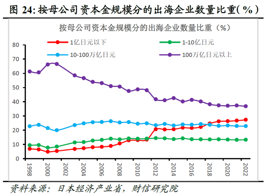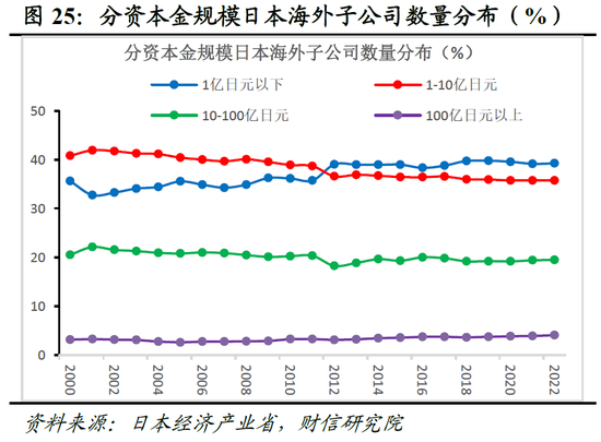 四是日本企业出海投履历局:大企业开路、中小企业梯队跟进。从出海投资主体看,大型企业在早期出海中饰演了领头羊的扮装。如2000年前后老本金范围在100亿日元以上的超大型企业在外洋配置的子公司数目占一起外洋子公司的比重在60%以上(见图24),成为日本开拓外洋阛阓的前锋力量。相对而言,中微型企业由于范围扬弃,更多处于被迫和侍从的地位。但跟着日本企业外洋阛阓竞争力和认同度的提高,加上日本国内需求永远疲弱,中小企业也缓缓积极布局外洋阛阓,成为日本企业出海的边缘增量,如老本金范围在1亿日元以下企业配置的外洋子公司数目占比,由2000年的4.8%提高至2022年的27.3%(见图24)。从日本外洋子公司的范围看,老本金范围处于1万日元以下和1-10亿日元之间的企业数目占比揣摸比重永远保管在75%傍边,而老本金跳动100亿日元以上的超大范围子公司占比则不及5%(见图25)。这反馈出日本企业在外洋阛阓布局时无数采纳了适当的策略,较小范围的子公司由于机动性更高,更容易凭证国际阛阓需乞降政策的变化调节政策,幸免了激进推广可能带来的风险。