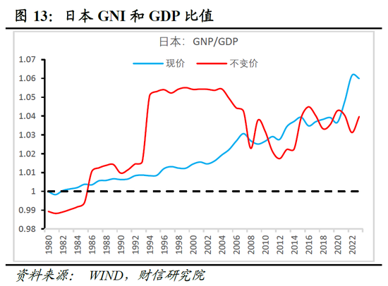 二是出海带动日本企业收入和利润率双提高,部分冲销了国内需求疲弱对服务和国民收入的牵累。一方面,外洋阛阓的捏续推广显耀提高了企业收入。以1990年为基准,2022年日本外洋子公司销售收入增长了2.6倍,同期国内企业只增长了0.2倍。这使得外洋子公司销售收入占比从1990年的7.8%提高至2022年的20.3%(见图11),标明日本企业通过外洋阛阓推广兑现收入范围的显耀增长。另一方面,企业出海有用对消了内需低迷对国内企业利润率的负面影响。1993年之前,国内企业利润率呈现下降趋势,但跟着外洋阛阓范围的扩大和竞争力的提高,外洋子公司的利润率稳步增长,带动国内公司利润率回升(见图12),即在国内需求捏续疲软的情况下,日本企业的利润空间并未受到压缩。总体看,高增的外洋收入和利润对日本国民钞票酿成补助,保障了国内企业的捏续发展和住户服务基本盘的踏实,一定进程上缓解了日本经济濒临的低通胀、低增长挑战。如1990年代以来,不管是按口头价钱如故不变价钱策划,日本的国民总收入(GNI)与国内坐蓐总值(GDP)的比值一直在提高(见图13),反馈出外洋收入对日本经济的补助作用在握住增强。
