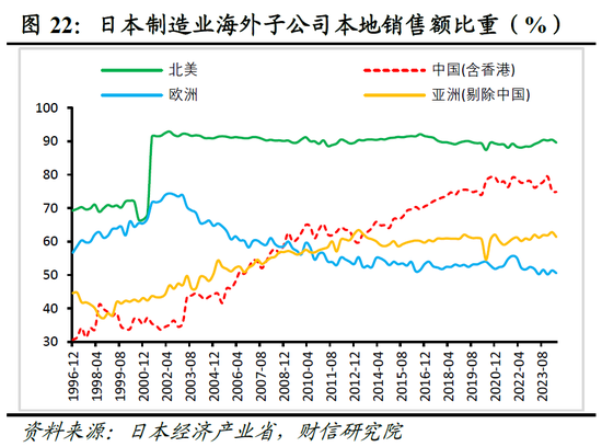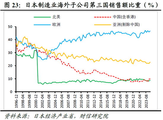 三是企业需凭证不同目的阛阓机动调节产销策略。企业出海的最终目的在于霸占大家阛阓份额,但由于不同目的阛阓特色不同,日本企业对主要目的地罗致了不同的产销策略。具体看,好意思国:原土化策略为主。由于好意思国为大家第一大挥霍阛阓且好意思日制造业不存在胜仗竞争相关,2000年以翌日本在北好意思(好意思国为主)配置的外洋子公司所坐蓐的商品约9成齐胜仗销往当地阛阓(见图22)。企业在好意思国的投资策略一直齐专注于深入挖掘和夸耀当地阛阓的需求,通过在当地坐蓐和销售,兑现了与好意思国阛阓的概括会通。欧洲:由原土化向外售歪斜。早期日本企业在欧盟投资罗致与好意思国同样的原土化策略,在2002年之前日本外洋子公司在欧盟阛阓的腹地销售比重捏续高于50%且握住攀升。但由于德法等国也均以制造业立国,日本企业应时调节原土化策略,通过积蓄技巧上风将更多在欧洲坐蓐的商品销往第三方阛阓,如日本在欧洲配置的子公司总销售额中,销往第三方国度的比重由2002年二季度的24.5%提高至2024年二季度的46.8%,提高理解(见图23)。中国:外售为主转向原土化策略。关于亚洲阛阓,日本企业投资的起始目的在于期骗当地的低成本上风,振荡国内多余的逾期产能。因此,早期日簿子公司在亚洲坐蓐的居品大多之外售为主,腹地阛阓销售比例不及50%(见图22),跳动一半的居品回流至日本或销往其他国度。然而,跟着中国加入WTO和国内制造业及内需阛阓的快速增长,日本企业在中国的坐蓐和销售策略发生了显耀调节,一方面加多了中国阛阓的腹地销售比例,以夸耀日益增长的国内需求(见图22),另一方面,跟着成本上风的振荡,中国的代加工业务缓缓由成本更低的东南亚国度邻接。