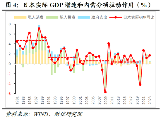 一是“泡沫经济”冲破导致私东说念主部门资产欠债表减弱,日本国内需求捏续下台阶。1990年前后,日本捏造经济的两大代表指数—日经225指数和日本城市住宅地皮价钱指数双双从高点回落,累计最大降幅别离近80%和超50%(见图3)。两大资产价钱下降,使得此前的钞票效应和典质效应逆转,住户和企业部门资产增长堕入停滞致使缩水。经济遇到重创,安全资产匮乏,两大部门纷繁转向欠债最小化,即通过罢手假贷或偿还债务的花式斥地资产欠债表,进而导致私东说念主部门挥霍和投资举止堕入低迷,对日本国内需求酿成捏续牵累(见图4)。