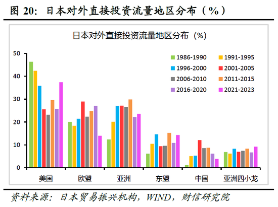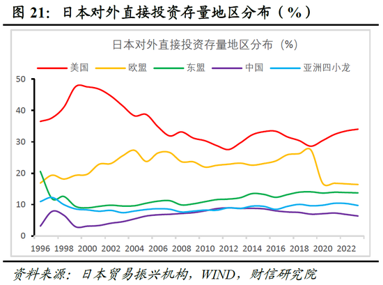 二是出海目的地因投资动机不同而改变。从日本对外投资数据看,好意思欧等挥霍国阛阓一直是日本企业出海的主要目的地,不管是年度流量数据如故存量投资范围,对好意思国和欧盟胜仗投资占比之和大部分时刻跳动50%(见图20-21),但日本企业出海目的地也因投资动机发生理解变化。其一,早期阶段,日本企业出海目的在于躲藏与好意思国的贸易摩擦和占据大家阛阓份额,因此相对锻练的好意思国阛阓对日本企业更具有眩惑力,1986-2000年日本对好意思胜仗投资流量占比捏续跳动欧盟和亚洲等其他两大目的地,且早期占比一度接近50%(见图20)。其二,跟着日本企业在西洋阛阓站稳脚跟,劳能源成本缓缓成为企业出海有绸缪的遑急考量身分,为此日本企业缓缓将相对逾期的产业转向成本更为便宜的亚洲国度,1996-2000年日本对亚洲胜仗投资占比跳动好意思国和欧洲,成为企业出海的遑急增量。从具体国度看,日本对东盟和亚洲四小龙的对外投资占比永远保捏高潮趋势,但2011年以来跟着中国劳能源成本加多,日本对中国胜仗投资比重呈下降趋势(见图20)。其三,跟着新一轮科技改变和逆大家化海潮兴起,频年翌日本再度加大对好意思欧阛阓的投资力度(见图20),以提高自身的技巧水谦让大家竞争力。总体看,日本早期出海目的地为躲藏贸易摩擦和占大家阛阓份额倾向好意思国,后因劳能源成自己分转向亚洲,频年来又因科技改变和逆大家化海潮加大对好意思欧投资。