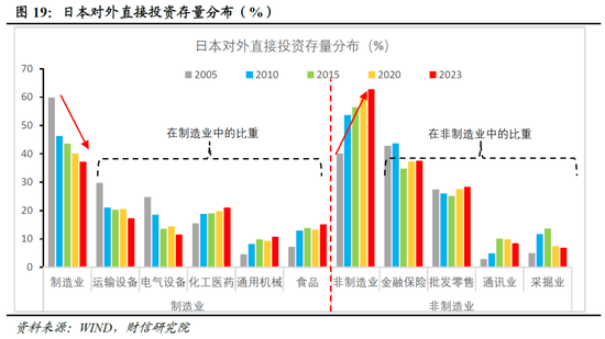 一是出海产业驻足于出口结构布局,先制造业后非制造业。从日本对外投资存量的变迁看,日本出海呈现出两大特征:一是早期依据出口居品国际竞争上风布局,投资汇集于运载斥地等制造业。如日本早期对外投资行业主要汇集在运载斥地、电气斥地、化工医药等制造业行业,而这些行业在日本出口结构中永远占据主导地位(见图18-19),这意味着在1990年代初期这些行业依然具备大家竞争上风,为策划行业出海奠定了基础。二是跟着出海奏效表示与大家需求结构调节,产业从制造业向非制造业过渡,产业结构向浅笑弧线两头蔓延,说明为制造业投资存量占比下降,非制造业占比高潮,且投资向落魄游高附加值行业调理。一方面,日本制造业投资存量占比由2005年的59.8%降至 2023年的37.2%,同期非制造业占比提高22.6个百分点至62.8%,主导地位发生逆转(见图17)。另一方面,出海产业结构缓缓进取游研发和下流挥霍等高附加值行业调理。如制造业中,食物等挥霍类、化工医药等高技巧类对外投资存量占比举座呈高潮趋势;非制造业中,金融保障等坐蓐性服务业、批发零卖等偏下流行业对外投资存量捏续占大头,且频年来比重呈高潮趋势(见图19)。